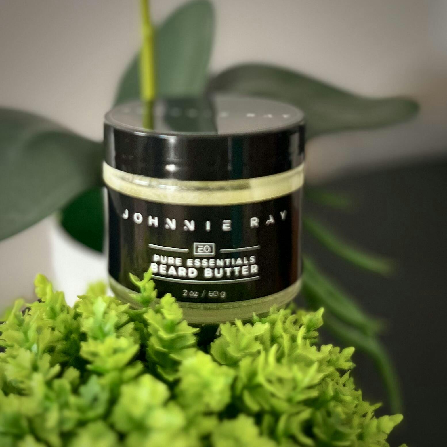 5 jars of Johnnie Ray Pure Essentials Beard Butter stacked on black marble counter